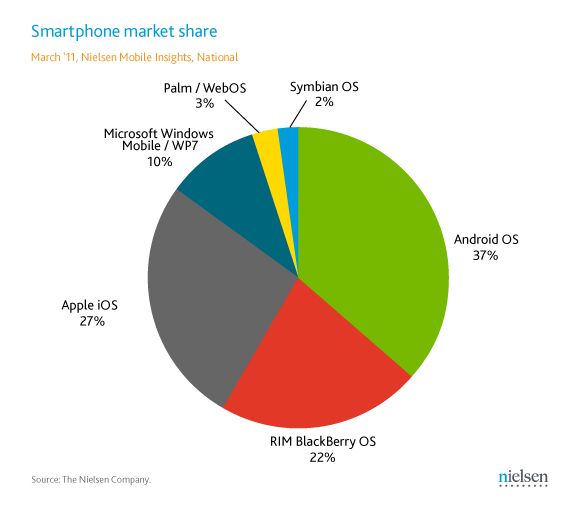 Android jest jednak królem pośród klientów, którzy dokonali zakupu w marcu. Dokładnie połowa sprzedanych smartfonów w tym miesiącu korzystała z platformy stworzonej w Mountain View. 25 proc. z tego tortu przypadło iOS, a 15 proc. – RIM. Globalny udział w rynku to 37 proc. dla Androida i 27 proc. dla iOS.