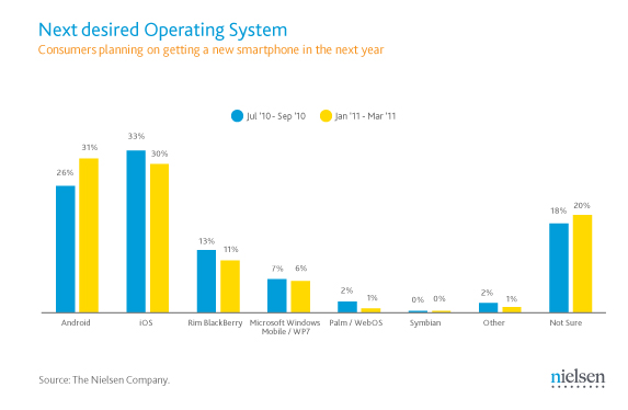 Badania był prowadzone w przedziale od stycznia do marca na klientach, którzy w ciągu najbliższego roku rozważają zakup telefonów. Wyniki wskazują, że 31 spośród respondentów planuje zakup urządzenia wykorzystującego. To wzrost o 5 punktów proc. w porównaniu z analogicznym badaniem przeprowadzonym w okresie od lipca do sierpnia 2010 roku. Jest to także zmiana na pozycji lidera. Poprzednio najpopularniejszym wyborem konsumenckim był iOS. Depcze on jednak po piętach zwycięzcy. Odnotował bowiem popularność pośród 30 procent badanych.