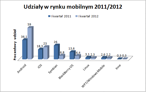 Platforma Google rozwija się w niesamowitym tempie, procent sprzedanych telefonów z tą platformą wzrósł przez rok z 36,1% aż do 59%. Mówiąc konkretnymi liczbami, pierwszego kwartału 2011 roku – 36,7 milionów smartfonów z Androidem znalazło swoich właścicieli. Z kolei w 1 kwartale 2012 – oszałamiające 89,9 mln.