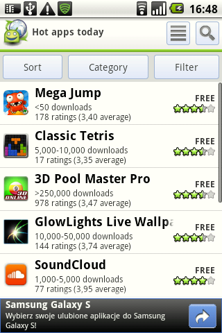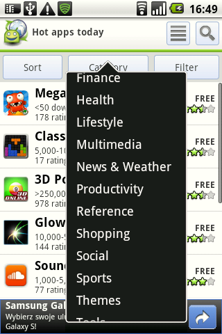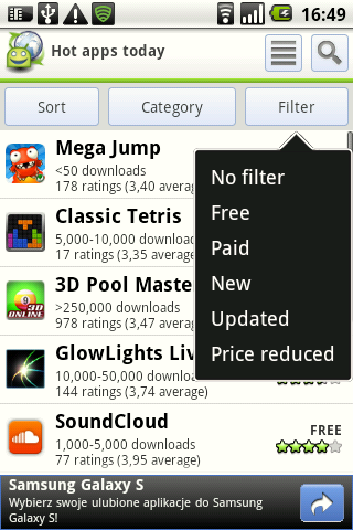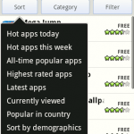 Uściślijmy – AppBrain nie jest powieleniem Marketu. To system ułatwiający dostęp do niego. Jedną z najważniejszych funkcji, które posiada, to sortowanie wyników przeglądania czy wyszukiwania. Czy interesują nas najświeższe aplikacje, czy te które był popularne w danym dniu tygodniu czy w ujęciu globalnym. Możemy też podejrzeć te, które są najwyżej oceniane lub cieszą się wzięciem w danym kraju. Ponadto istnieje także możliwość sortowania według danych demograficznych – AppBrain daje bowiem możliwość stworzenia własnego profilu użytkownika. Ponadto możemy także użyć jednego z 5 filtrów prezentujących aplikacje darmowe, płatne, najnowsze, ostatnio aktualizowane oraz te, których cena została obniżona. Sitem sortowania i filtrowania możemy także potraktować wyniki indywidualnego wyszukiwania.