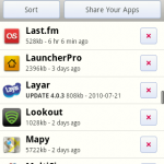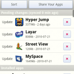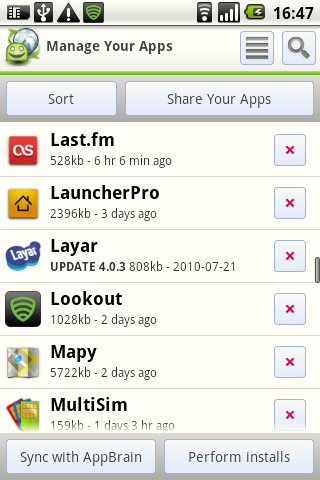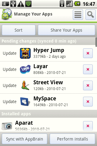 Aplikacja jest także wygodnym narzędziem zarządzania zainstalowanym oprogramowaniem, w tym menedżerem aktualizacji. Zarówno update jak i instalacja nowego produktu odbywa się – do wyboru – poprzez stronę AppBrain lub przez Usługę Market. Z tego też względu soft może pokazywać nam pozycje dostępne w innych krajach, np. Need for Speed: Shift, pomimo, że w Polsce nie są one dostępne. Dodatkowo ceny płatnych pozycji prezentowane są w dolarach.