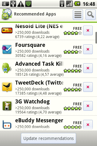 Kolejną ważną i – w mojej ocenie – niezwykle przydatną funkcją, jest system rekomendacji aplikacji. W oparciu o zbiór programów zainstalowanych w naszym telefonie oraz punkty rekomendacji innych użytkowników systemu, AppBrain może zaprezentować nam zbiór produktów, które mają szansę nas zainteresować. I wierzcie mi, można tam znaleźć wiele ciekawych propozycji. Warto od czasu do czasu zajrzeć na tę listę i przetestować co poniektóre aplikacje.