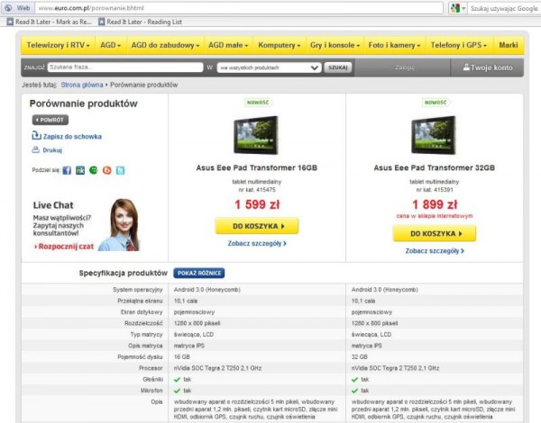 A na zakończenie jeszcze mała ciekawostka: RTV Euro AGD wprowadziło do oferty modele Asus Eee Pad Transformer WiFi z procesorem Tegra 2 2,1 GHz [sic!] Spójrzcie sami: