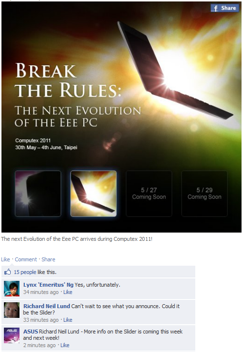 Upływający tydzień na facebookowej stronie Asusa upływa pod szyldem Computex 2011. Nie dziwi nas to i właśnie dlatego stale wypatrujemy przesłanek dotyczących nowych produktów. W poniedziałek informowaliśmy Was o teaserach urządzenia, które miałoby być czymś pomiędzy smartfonem a tabletem. Nasze przypuszczenie padło na Asus MeMo. Dzisiaj tajwański koncern zapowiada zmiany w linii Eee PC. Zakładamy, że chodzi o netbook z Chrome OS.