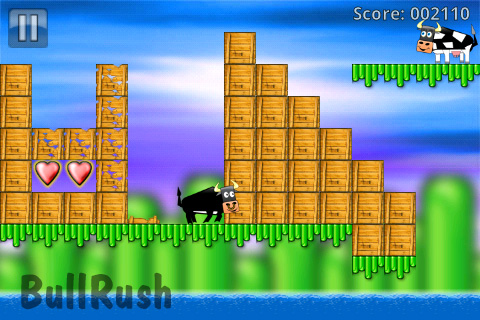 Tu rozpoczyna się prosta, ale sympatyczna gra polskiej firmy Netox. Naszym zadaniem jest pokonywać kolejne etapy, na końcu których czeka wybranka serca naszego bohatera. Podczas pokonywania poziomów gracz może zbierać punktowane dodatkowo elementy – kwiat lub serca. Punkty za zebrane rzeczy kumulowane są po zakończeniu każdego z etapów. W Bull Rush, podobnie jak w Angry Birds, istnieje system punktowania gwiazdkami (od 1 do 3) za przejście każdego z poziomów.