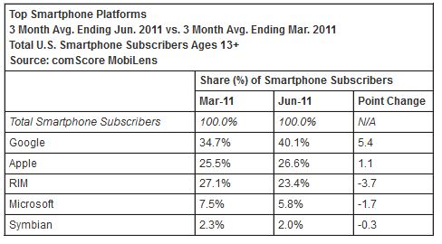 System od Google ma już 40% rynku i w ciągu ostatniego kwartału zyskał 5 punktów procentowych. Apple przekroczył 25%, ale jego wzrosty nie są już tak imponujące, jak w przypadku Androida.