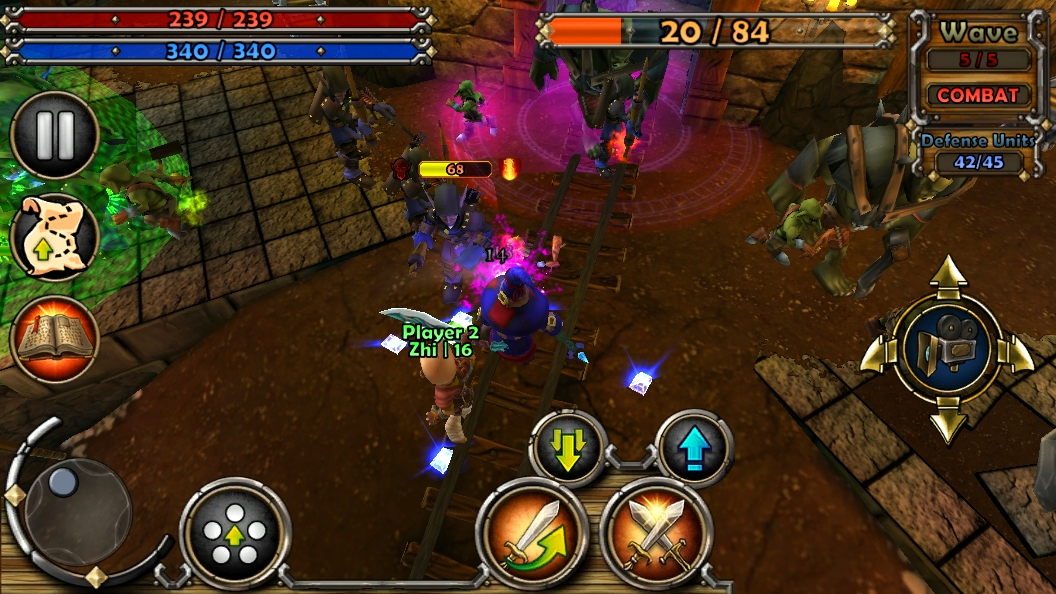 Interfejs gry jest jest w miarę przejrzysty. Sterowanie domyślnie odbywa się na całym ekranie (wskazujemy miejsce lub wroga), ale można pokierować wirtualnym padem (a właściwie kierownicą), który jednak nie wszystkim musi się podobać. Pod prawą ręka mam przyciski odpowiedzialne za atak, skok, interakcje itp.