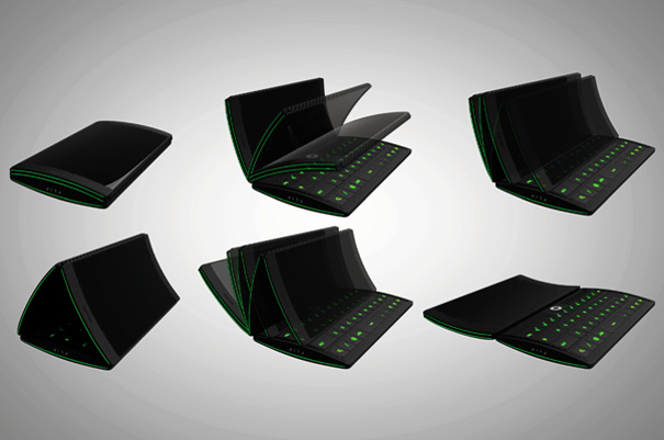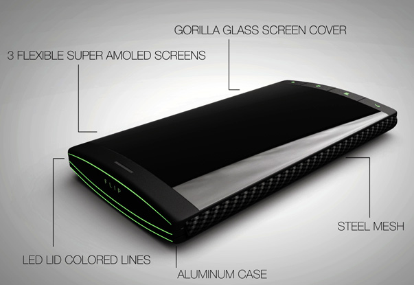 Czy to budzik? Czy to portfel? A może wazon na kwiaty? Nie! To telefonu o grubości nieprzekraczającej 0,5 cm, wykorzystujący 3 ekrany AMOLED ułożonymi jeden pod drugim oraz klawiaturą. Wykorzystujące elastyczność ekranów i materiału urządzenie pozwala na tworzenie zeń najprzeróżniejszych kształtów. Ekrany współpracują ze sobą więc przeniesienie obiektu z pierwszego na ostatni nie stanowi problemu. Podobnie jest w przypadku komunikacji z innymi modelami. Niemożliwe?