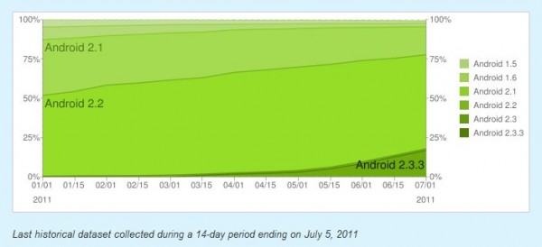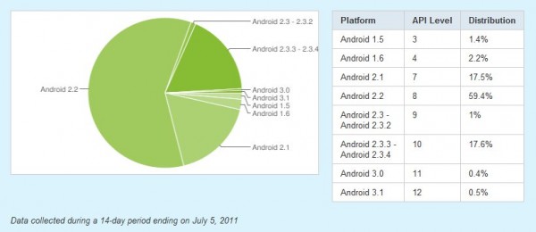 Android 2.2 Froyo najpopularniejszą wersją systemu dla urządzeń przenośnych – wynika z raportu opublikowanego na blogu jego developerów. I choć w dalszym ciągu utrzymuje on tendencję spadkową, wciąż jest obecny na 59,4 proc. wszystkich urządzeń. Tuż za nim rośnie w siłę Gingerbread, przyspieszający w wyścigu o pierwsze miejsce o 9,5 pkt. proc. wykrawając dla siebie 17,6 proc. tortu. Jest to wynik wyłącznie dla wersji 2.3.3 – 2.3.4. Poprzednie wydania „piernika” w dalszym ciągu lawirują w okolicach 1 proc.
