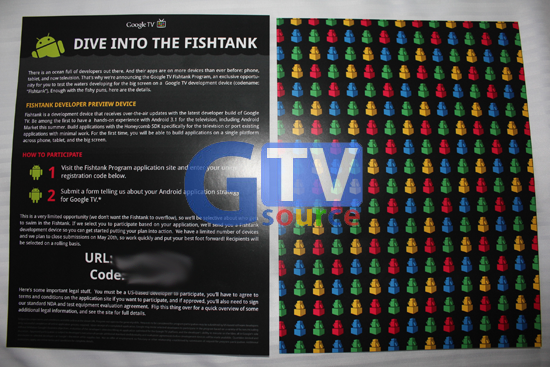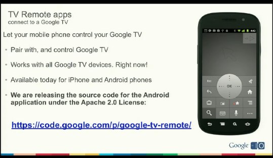 Podczas spotkania ogłoszono także udostępnienie kodu źródłowego istniejącej aplikacji dla Androida, za pomocą której użytkownik ma możliwość kontrolowania Google TV. Dostępny jest także kod protokołu Anymote, wykorzystywany przez wspomniane oprogramowanie. Do dyspozycji programistów zostanie oddany również program „Fishtank”, w ramach wybrani twórcy z najciekawszymi pomysłami otrzymają zestawy do testowania opracowywanych programów.