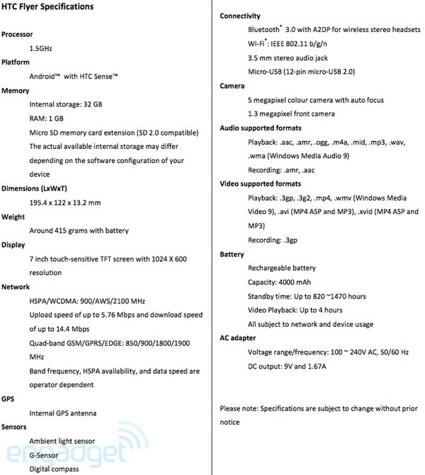 Specyfikacja HTC Flyer nie jest zaskoczeniem w odniesieniu do plotek. Aluminiowa obudowa i siedmiocalowy ekran o rozdzielczości 1024 x 600 skrywające jednordzeniowy 1,5 GHz procesor. 1GB pamięci RAM i 32GB powierzchni dyskowej. Pracę urządzenia będzie wspierał Android 2.4. To nie koniec dziwnych posunięć firmy. Mimo iż wyświetlacz będzie pojemnościowy to w zestawie HTC Flyer znajdziemy także… pojemnościowy stylus.