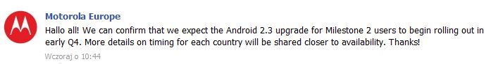 Na początku Q4 2011 rozpocznie się update systemu w telefonach Motorola Milestone 2. Następca pierwszej Motoroli z Androidem niebawem otrzyma Gingerbreada.