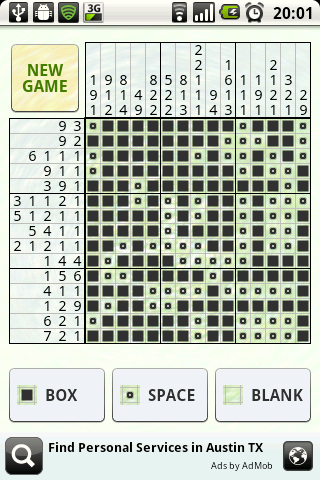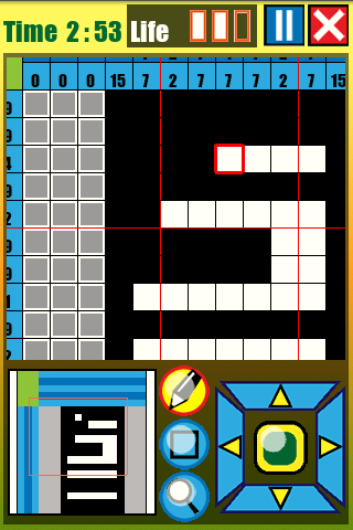 Jest to najuboższa graficznie aplikacja wykorzystująca pomysł nonogramów z dostępnych w Markecie. Nie znaczy to jednak, że bezwartościowa. Szczególnie polecałbym ją początkującym. Jest o tyle wygodna, że w momencie wykorzystania pól w danej linii, cyfry informujące o kombinacjach są podświetlane na zielono. Dodatkowo istnieje opcja pobierania zadań z serwerów twórców gry. Dużą wadą jest brak wygodnego sterowania (dotykowo) przy większych planszach. Gra na urządzeniach z małymi ekranami będą w tym wypadku wyjątkowo uciążliwa.