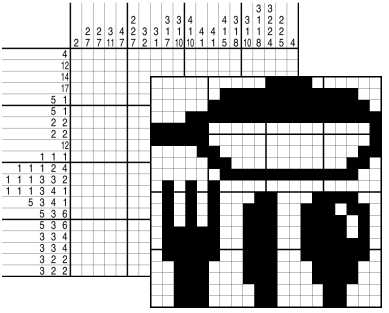 To łamigłówka polegająca na zaczernianiu pól diagramu. Zaczernione pola utworzą rysunek. To, które pola trzeba zaczernić, wskazują liczby obok diagramu. Liczby z lewej strony każdego wiersza określają, ile grup czarnych pól jest w danym rzędzie i ile czarnych pól jest w każdej grupie.