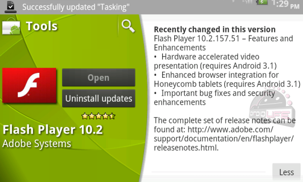 Adobe wprowadził do Android Market najświeższą wersję Flash Player 10.2.157.51. Wszystko byłoby super, gdyby nie jedno zastrzeżenie pojawiające się w opisie aplikacji – niektóre z nowo wprowadzanych funkcji dostępne są dla Honeycomb 3.1. Czyżbyśmy coś przeoczyli?