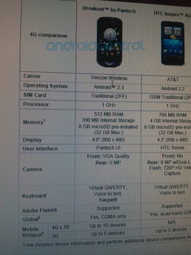 Model Pantech Breakout, to urządzenie z obsługa LTE, procesorem 1GHz, 512MB pamięci RAM, i 390MB pamięci wewnętrznej, ekranem 4″ o rozdzielczości 800 x 480 oraz aparatem 5MP.