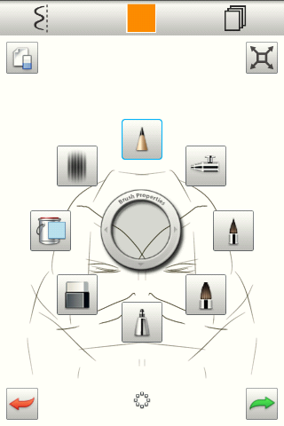 Pierwsze uruchomienie aplikacji to krótki tutorial. Nawet bez niego intuicyjne menu pozwala w szybkim tempie opanować możliwości szkicownika. Menu widoczne jest zawsze w centralnym punkcie dolnego brzegu ekranu. Aktywując do dyspozycji mamy wybór narzędzia, koloru, tworzenie warstw, a także narzędzia „Cofnij” i „Przywróć”.