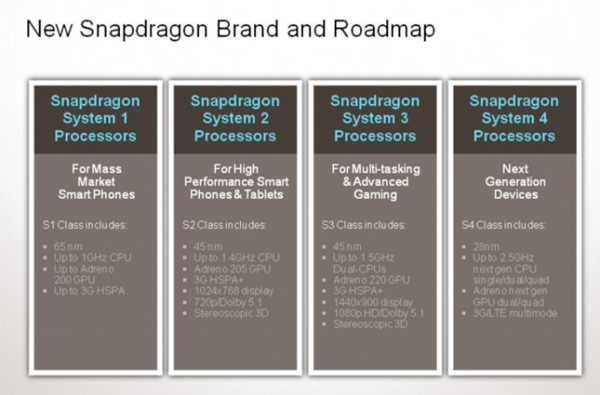 Układy zostały pogrupowane w zależności od mocy i wydajności. Powstałe w ten sposób cztery grupy dostały oznaczenia: S1, S2, S3 i S4. „1” to te występujące w urządzeniach masowych, natomiast w grupie z cyfrą „4” znalazły się procesory marzeń, te, nad którymi firma wciąż pracuje. Znajdą się w niej chipsety zbudowane w technologii 26 nm, z zegarem do 2,5 GHz jedno, dwu i czterordzeniowe. Także nieokreślony układ graficzny Adreno zastosowany przy ich budowie otrzyma dwa lub cztery rdzenie. To jednak jest na tyle odległą przyszłością, że nawet sam producent nie chce określać jeszcze pełnej charakterystyki. Na osłodę chwali się natomiast wydajnością S3.