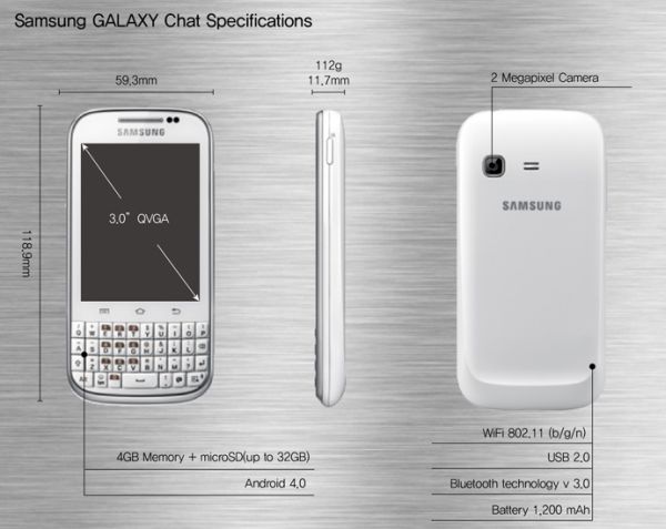 Samsung Galaxy Chat, bowiem tak dokładnie się nazywa nowy sprzęt z niższej półki cenowej, oferować będzie ekran o przekątnej trzech cali, co jak na smartfon z QWERTY jest wynikiem całkiem niezłym. Jego grubość wynosi 11.7mm, z kolei waga to 112 gramów. Samsung niestety póki co nie zdecydował się na ujawnienie częstotliwości taktowania procesora i wielkości pamięci RAM, co wynika prawdopodobnie z faktu, że będą to wartości raczej przeciętne.