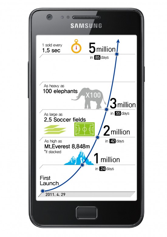 Samsung, podczas wczorajszego eventu w Nowym Jorku, nie omieszkał pochwalić się wynikami sprzedaży swojego flagowego produktu – Galaxy S II. Do tej pory sprzedano już 5 milionów egzemplarzy tego niezwykle popularnego smartfonu. Wynik ten koreańska firma osiągnęła po 85 dniach sprzedaży.