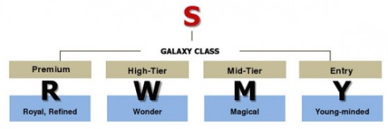 Klasa R to urządzeni z górnej półki, kosztujące 300-400 euro, W to telefony za 200 – 300 euro, M – 130-200 euro, natomiast Galaxy Y to masówki poniżej 130 euro.