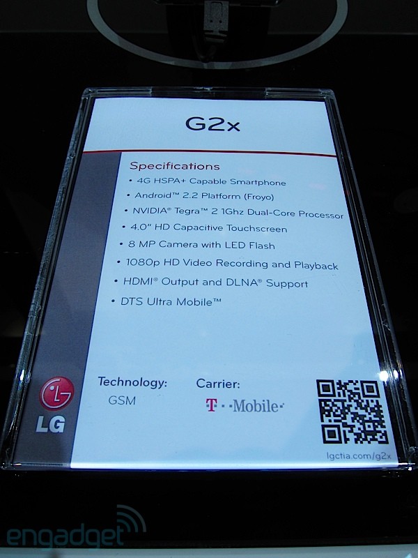 T-Mobile G2X to nic innego jak LG Optimus 2X w barwach Magenty. Wyposażony w dwurdzeniowy procesor Tegra 2 o częstotliwości 1 GHz, czterocalowy ekran oraz moduł HSPA+ 4G. Sprzęt posiada także tylną kamerę 8 MP z lampą błyskową LED, i przednią 1.3 MP do videorozmów.