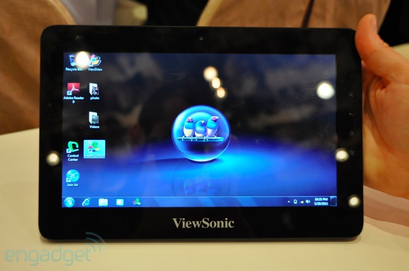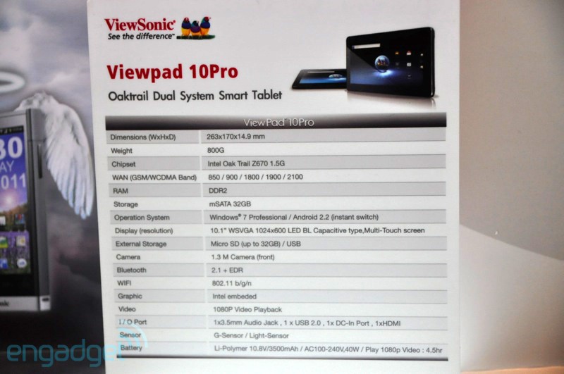 ViewPad 10Pro to przede wszystkim pierwsza oficjalna prezentacja urządzenia z procesorem Intel Oak Trail Z670 z zegarem 1,5 GHz. Wewnątrz znajdziecie dwa systemy: Windows 7 Pro i… Android 2.2 [sic!]. Wersję drugiego systemu pozostawimy bez komentarza. Choć jak zaznacza producent – Android jest do prostych zadań jak przeglądanie Internetu, Windows 7 Pro do zastosowań biznesowych.